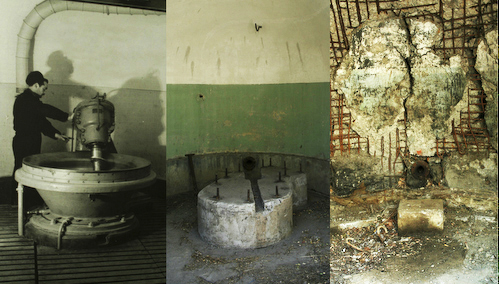 The first and the last images of this collage are of the same mixing room… the mixer and the basement simply disappeared, in 1961. Notice how the mixer, vaporizing during the explosion, 'protected' the wall immediately behind...