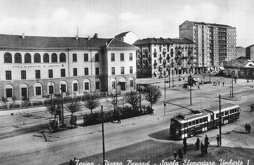 Ancora in piazza Bengasi: vediamo a fine anni 30 il filobus 55 per Nichelino fermo al capolinea, allora davanti alla scuola Umberto I