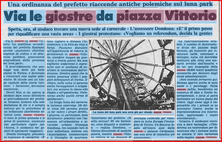 ![]() Uploaded with ImageShack.us ![]() Uploaded with ImageShack.us "andiamo in piazza Vittorio?" era la domanda che da piccoli si cominciava a fare, appena si sentiva in giro aria di Carnevale; e la visita alle giostre in piazza era di prammatica. Più grandicelli, si andava da soli, magari, per chi frequentava scuole lì vicino, all'uscita da scuola. Peccato sia tutto finito per un banale incidente nel 1977: da una ruota panoramica una vettura si staccò e precipitò a terra; delle tre bambine che si trovavano a bordo, una morì dopo una breve agonia, le altre tre rimasero ferite piuttosto gravemente. Ecco gli articoli de "La Stampa" dell'epoca ![]() Uploaded with ImageShack.us ![]() Uploaded with ImageShack.us Fu il pretesto per dichiarare che nella piazza le giostre non erano sicure, oltretutto ostacolavano il traffico, creavano ingorghi, ecc., e le giostre dall'anno successivo finirono alla Pellerina, al parco Carrara; pure bello, ma non è più la stessa cosa, come quando in piazza Vittorio dall'ottovolante e dalle ruote panoramiche ci si innalzava fino al secondo piano dei palazzi, con vista sulla piazza, sul Po. ecc. |