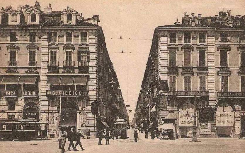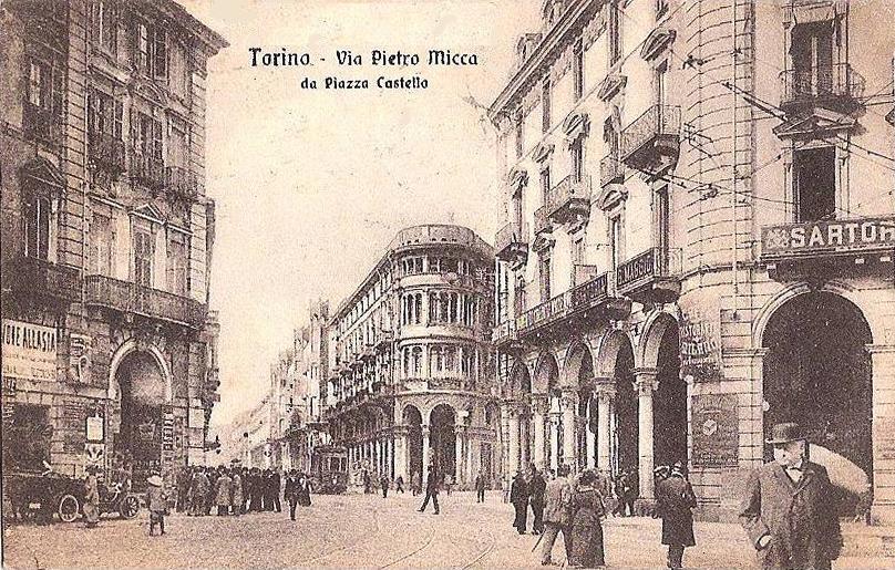 Ancora una foto che ci mostra i palazzi originari del lato Ovest di piazza Castello, andati distrutti nel bombardamento del 1943, ricostruiti nel dopoguerra, dagli anni 50 agli anni 70, in modo più "uniforme".