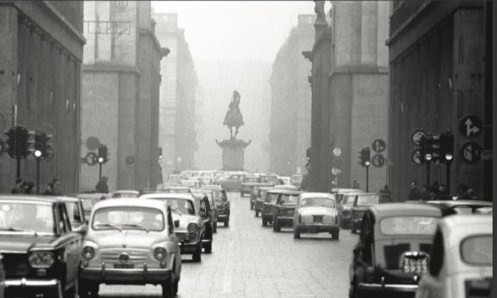 Era l'aspetto consueto di via Roma e piazza San Carlo fino agli anni 70, e anche un po' oltre! Quando, al contrario di oggi, erano state bandite le bici, considerate troppo "proletarie" per ben figurare nel "salotto" cittadino! Alla vecchia pratica del "passeggio" in centro, era stata sostituita, col boom della motorizzazione, quella del "giro" in macchina, come puro esibizionismo..... |