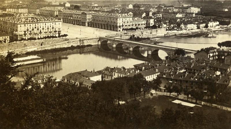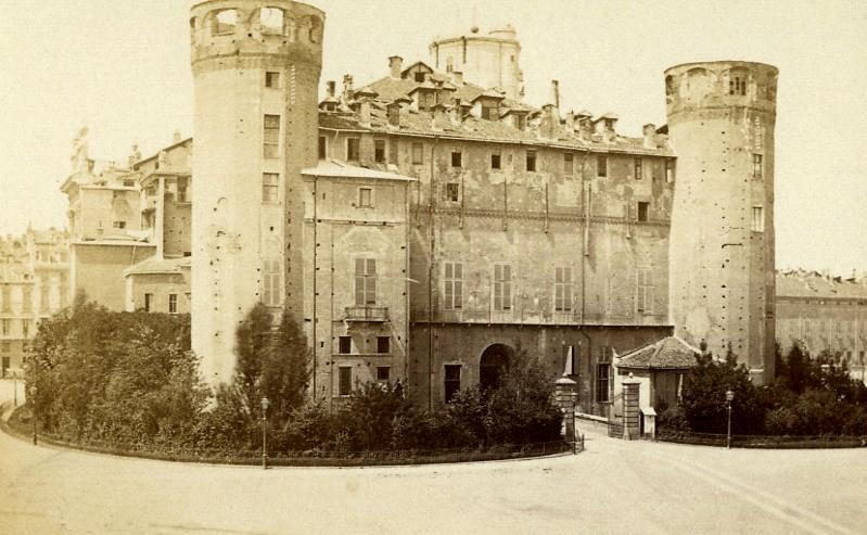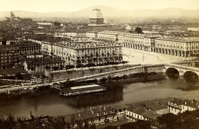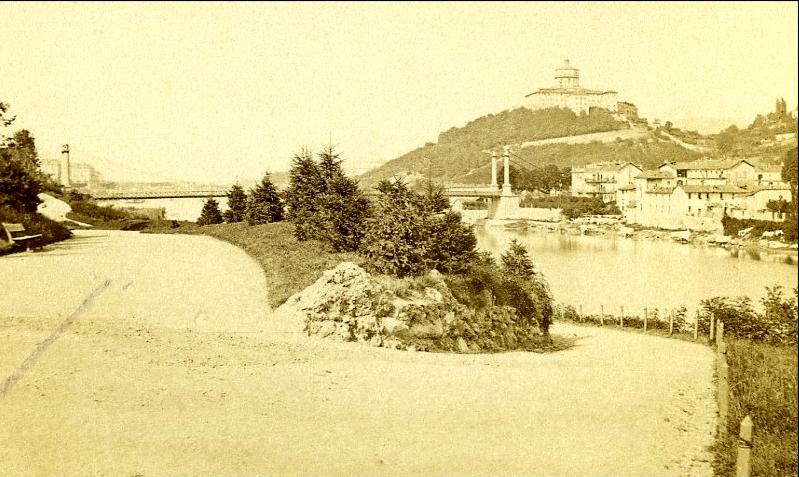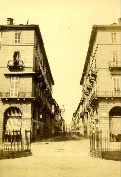 Interessante "stampa" dell'angolo tra corso Vittorio e via Madama, con il palazzo d'angolo non ancora costruito (al suo posto, una palazzina semirurale con giardino annesso) e sullo sfondo il Tempio Valdese con le guglie (ma le due sul corso sembrano non corrispondere molto al reale!).