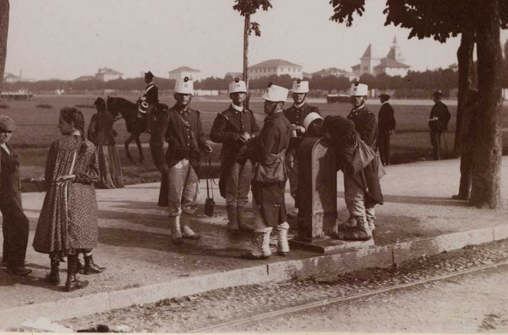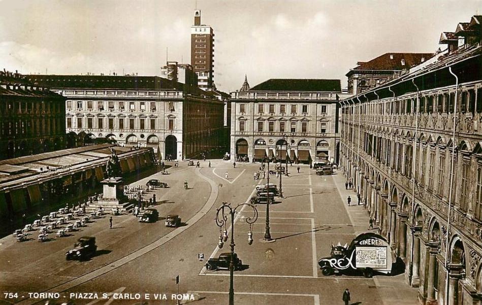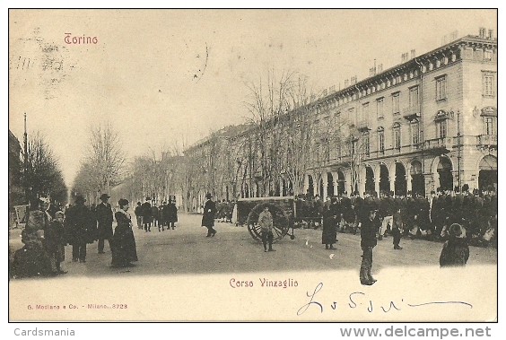 Bella immagine di corso Vinzaglio all'angolo con corso Vittorio Emanuele II: databile probabilmente nei primi anni del 900, si vedono soldati che tornano alle caserme dopo le manovre nella vicina piazza D'Armi .