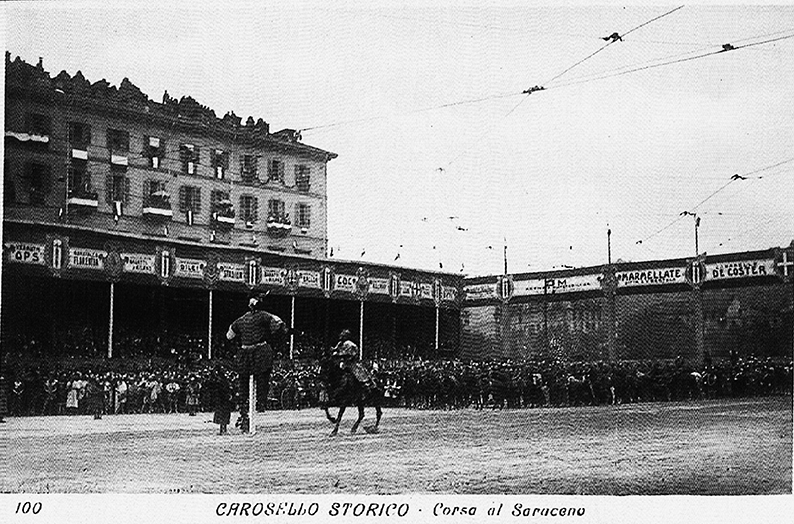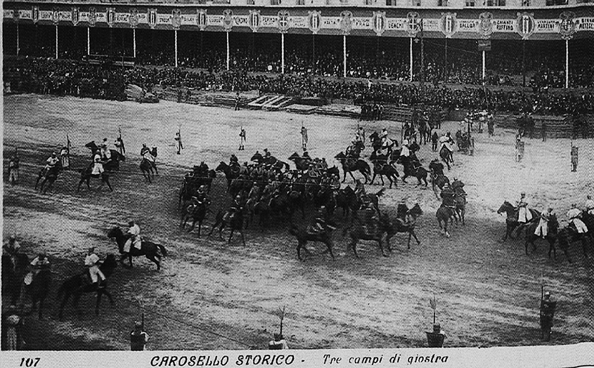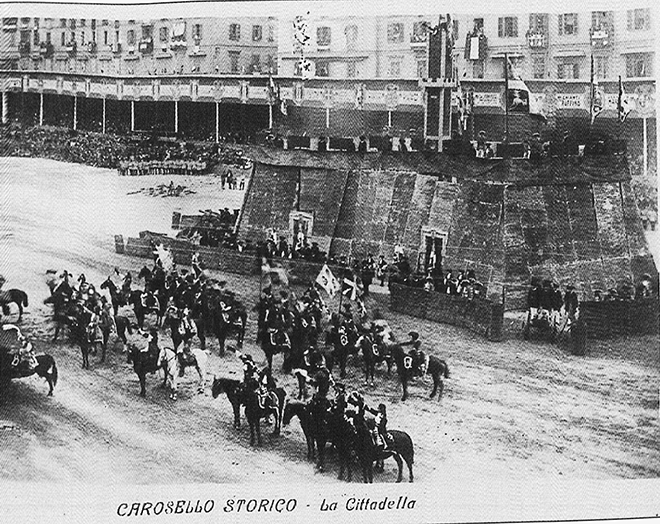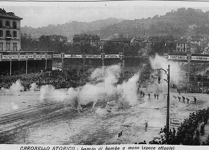 Corsa delle bighe romane ![]() Giostra medioevale ![]() Giostra del Saracino ![]() Rievocazione dell'assedio del 1706, con l'assalto alla Cittadella ![]() assalto alla trincea con bombe a mano della Grande Guerra ![]() ricordava mio padre che, negli anni subito dopo la prima guerra mondiale, le Forze Armate erano al "settimo cielo" e ringalluzzite per la Grande Vittoria (la precedente "figuraccia" di Caporetto era già passata nel dimenticatoio); probabilmente, questo carosello si inseriva in tale filone; come si è detto, assistette alle esibizioni anche il sovrano, giunto per l'occasione. Vent'anni dopo, sarebbe arrivata la "grande vergogna" dell'8 settembre, col collasso e disfacimento delle FF.AA.; un trauma che in un certo senso ancora oggi perdura, chè il prestigio è difficile da guadagnare ma facilissimo da perdere! Oggi penso che un carosello militare del genere, per lo meno in pieno centro di Torino, sarebbe improponibile; a malapena, viene "sopportata" la parata del 2 giugno ai Fori Imperiali, in occasione della Festa della Repubblica....