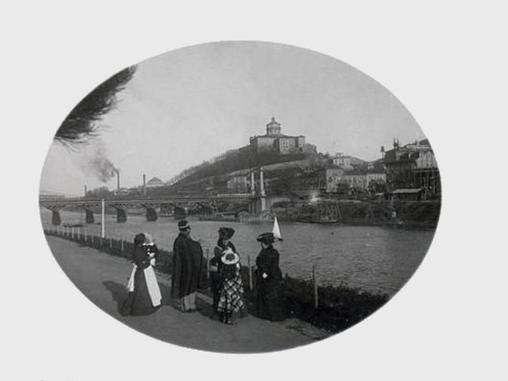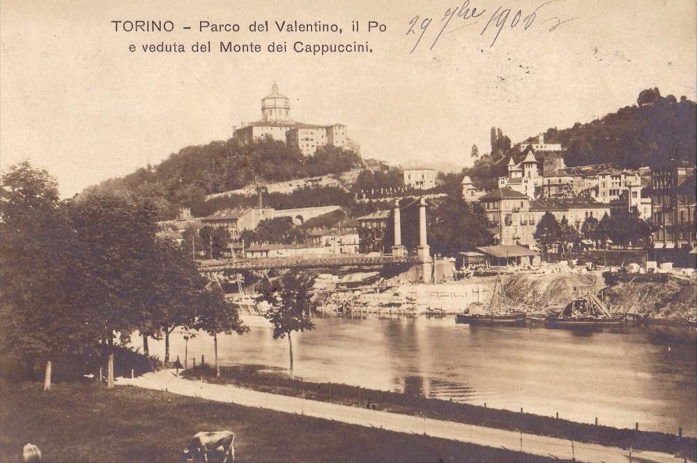 ![]() Siamo lungo il Po ma non in un Lungo Po: siamo ancora nel parco del Valentino (attuale viale Cagni ) e si vede l'inizio del cantiere per il ponte Umberto I° inaugurato quattro anni dopo senza le statue(durante l'Expo del 1911, rimanendo in tema, con le statue).