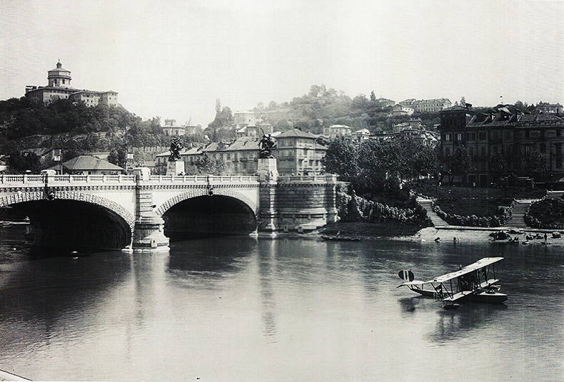 Seconda metà degli anni 20: l'idrovolante della linea Trieste - Venezia - Torino è in fase di ammaraggio sul Po, subito a monte del ponte Umberto