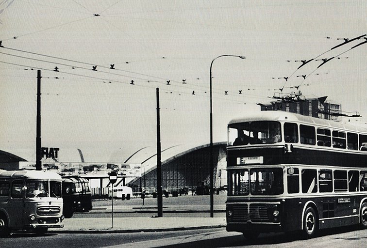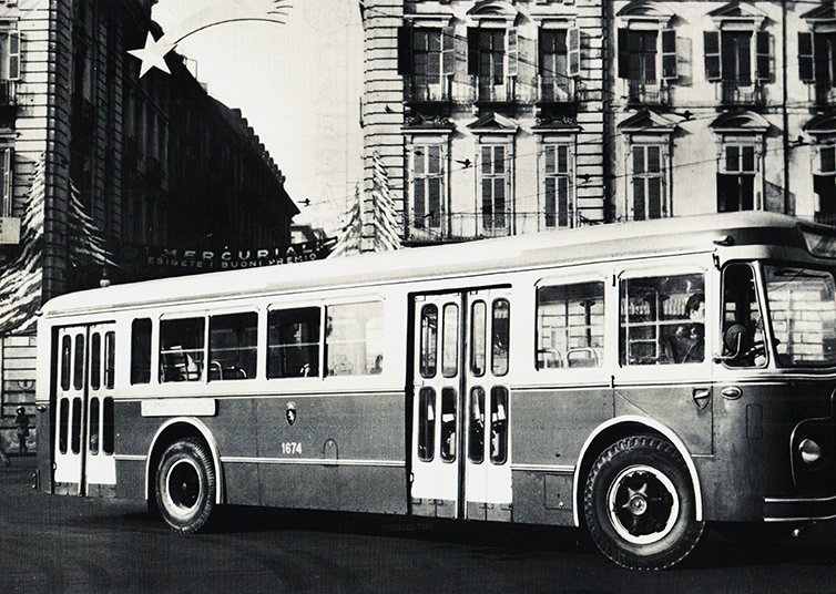 Sempre in tema di autobus: nel 1957 entrarono in servizio, sempre di costruzione Viberti, un numero consistente di bus monocassa, di cui vediamo il prototipo in piazza Castello