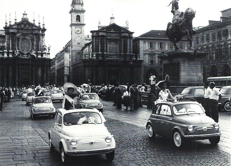 Nel 1930 Giovanni Agnelli venne informato dalle alte gerarchie del regime della inderogabile necessità di produrre un veicolo economico che non costasse più di 5000 lire (ricordiamo che erano i tempi del "se potessi avere mille lire al mese"); l'impegno ricadde sui progettisti Fiat, che però non seppero subito risolvere il problema con soluzioni tradizionali. Fu invece Oreste Lardone, geniale progettista dell'Itala, a ideare in progetto innovativo: motore bicilindrico raffreddato ad aria da 500 cc e trazione anteriore. Il "simulacro" del prototipo venne provato su e giù per le strade collinari, ma nel 1931 purtroppo fallì la prova per un principio d'incendio durante la salita di Cavoretto (presumo la strada vecchia), e, come conseguenza, Lardone venne licenziato. L'incarico passò all'ing. Dante Giacosa, allora all'inizio della carriera in Fiat, che, abbandonando il progetto innovativo (il regime pressava e metteva fretta), studiò un modello in scala ridotta della "Balilla" che superò le prove. Nel 1937 venne messa in vendita la prima 500A, poi denominata popolarmente "Topolino"; il costo però era lievitato a 8.900 lire, non esattamente popolare! Il modello, con alcune varianti nel dopoguerra, restò comunque in produzione fino a metà anni 50. Dopo la forzata parentesi bellica, l'ing, Giacosa riprese il progetto del predecessore, che era stato ignominiosamente cacciato, con motore bicilindrico raffreddato ad aria, spostato però nel posteriore e con trazione pure posteriore; il "parto" questa volta riuscì e nel 1957 la nuova 500 venne ufficialmente presentata; e fu la nascita di un mito! Qui vediamo la storica foto, nella primavera del 1957, della presentazione con sfilata in piazza San Carlo ![]() e qui sotto l'arrivo della carovana delle nuove 500 in piazza Castello